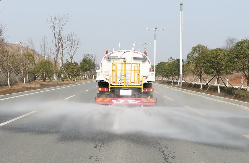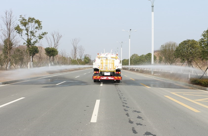 罐體采用4mm厚碳鋼板制作,罐體容積可達12噸-15噸,配備大功率專用灑水泵。前沖(噴)后灑,帶側噴,后置工作平臺,平臺上安裝綠化灑水高壓炮(炮噴射形狀可調成直沖狀、大雨、中雨、毛毛雨、炮可360度旋轉,射程>28米)。帶自流閥,消防接口。帶自吸泵,可抽水或從消防栓上連接注水。