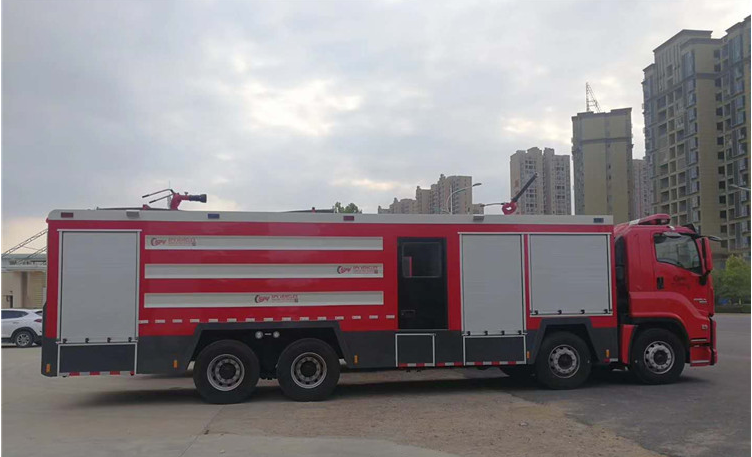 慶鈴五十鈴前四后八干粉消防車采用五十鈴460馬力前四后八底盤,軸距:1850+4575+1370,原裝單排駕駛室加裝獨立乘員室,裝取力器,傳動軸,制作12.1噸外露水罐碳鋼材質,3.3噸泡沫罐304不銹鋼材質,上海茸申CB10/100常壓消防泵,PL80消防炮,2噸干粉罐,30米干粉卷盤帶槍,6個70升氮氣瓶。