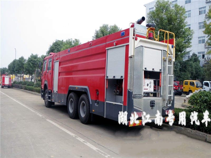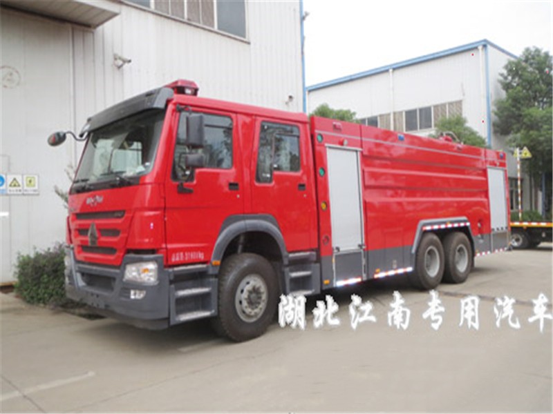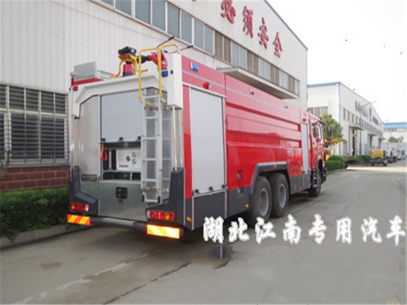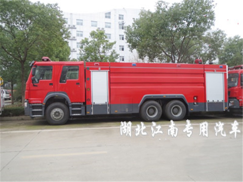 JDF5314GXFSG160型水罐消防車,采用重汽豪沃ZZ5347V4647E1底盤改裝而成。整車由消防員乘員室和車身兩大部分組成,乘員室為單排改雙排,可乘坐2+4人,該車為外露罐結構,車身前部為器材箱,中部為水罐,后部為泵房。載液罐體為優質碳鋼,與底盤采用彈性連接,載水15500kg,裝備了上海雄真消防設備有限公司生產CB10/60-XZ型低壓消防泵,額定流量60L/S,車頂安裝成都威斯特消防機械有限公司生產的PS60W型車用消防炮。該車最大的特點是載液量大、操控性好。可廣泛應用于公安消防隊、廠礦企業及社區、碼頭等場所,撲救大型油類火災或一般物質火災。