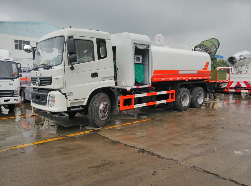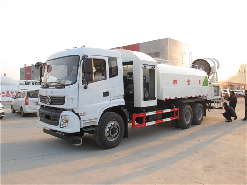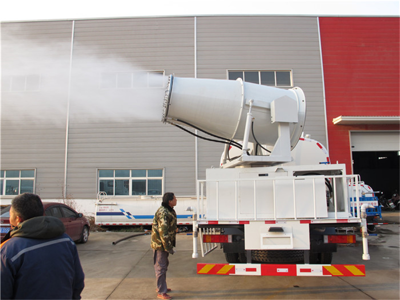東風隨專16噸抑塵車上裝分為霧炮、機組、水罐罐體三大部分,依靠環保霧炮上高速運轉的風機風送原理,把罐體內的水經霧化風送到30--120米遠的射程,霧炮車噴射的水霧顆粒極為細小,達到微米級,在霧霾天氣可以進行液霧降塵、分解淡化空氣中的顆粒濃度、能有效分解空氣中的污染顆粒物、塵埃等,將漂浮在空氣中的污染顆粒物迅速逼降地面,達到清潔凈化空氣的效果。