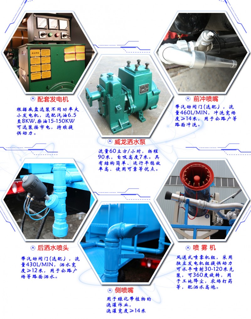 【上裝】:罐體容積11.5立方,方廂,副發(fā)動(dòng)機(jī)前包+左右卷閘門(mén),配置億豐50-110大流量專(zhuān)用灑水泵(可實(shí)現(xiàn)泵進(jìn)泵出功能),安裝前沖,后灑,側(cè)噴,高炮,高位花灑,帶兩根罐體等長(zhǎng)的吸水管,電子音樂(lè)喇叭和消防接口,后平臺(tái)帶80米噴霧機(jī)組。