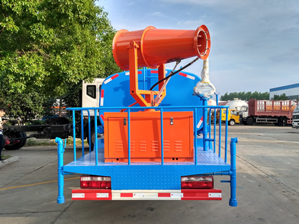 功能配置:帶前部沖洗路面噴灑裝置、后部扇形降塵噴灑裝置,兩側面噴灑裝置,帶后部工作平臺、平臺上安裝綠化灑水炮(炮噴射形狀可調),可調直沖狀、大雨、中雨、毛毛雨,可連續調節,最大射程可達28米,垂直吸程6.5米,揚程14米,另加裝高效率車載式風送噴霧機,噴藥炮霧化效果好,可遠程噴霧,水平射程達25米。帶消防接口、自流閥,可自吸自排。